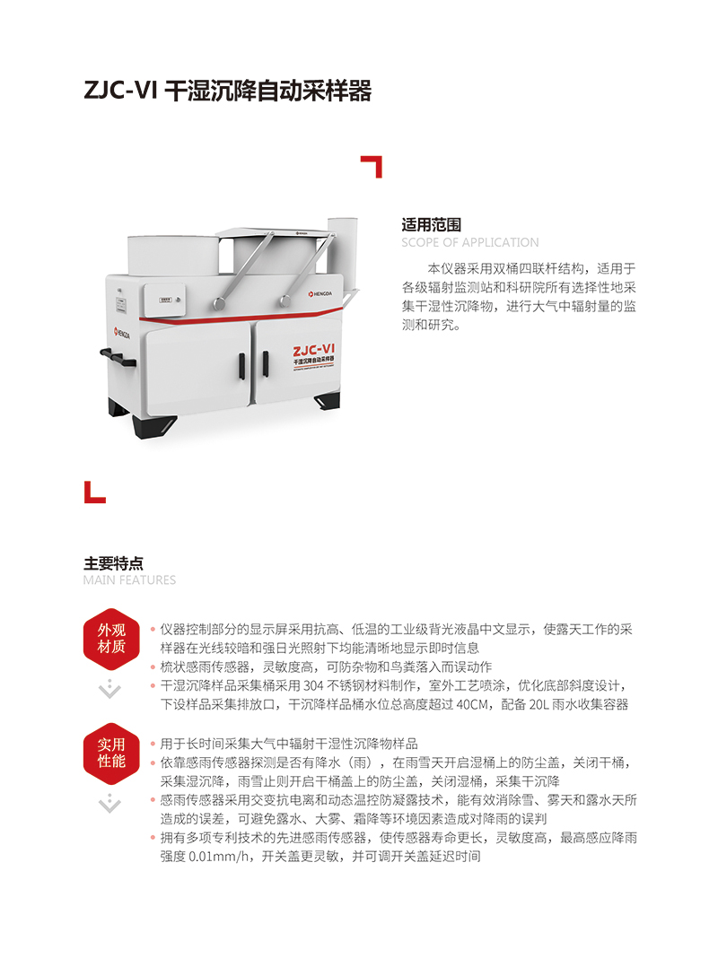 本儀器采用雙(shuāng)桶四聯杆結構,適用於(yú)各級輻射(shè)監測站和科研院所有選擇性地采集幹濕性沉降物,進行大氣中輻射量(liàng)的監測和研(yán)究。